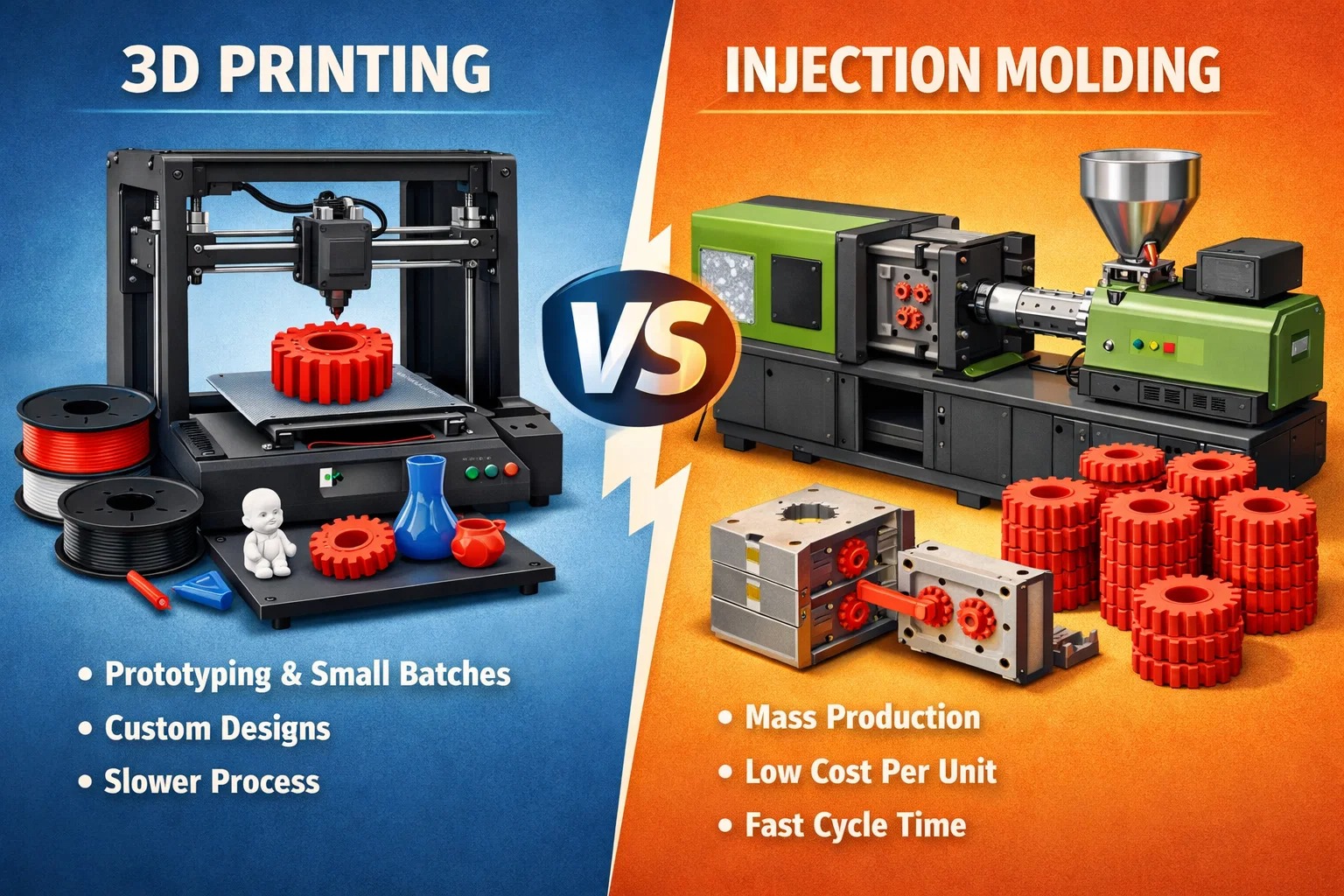Useimmat ihmiset ajattelevat, että se on yksinkertainen valinta "uuden koulun" (3D-tulostus) ja "vanhan koulun" (ruiskupuristus) välillä. Mutta rehellisesti? Se on harvoin enää niin mustavalkoista.