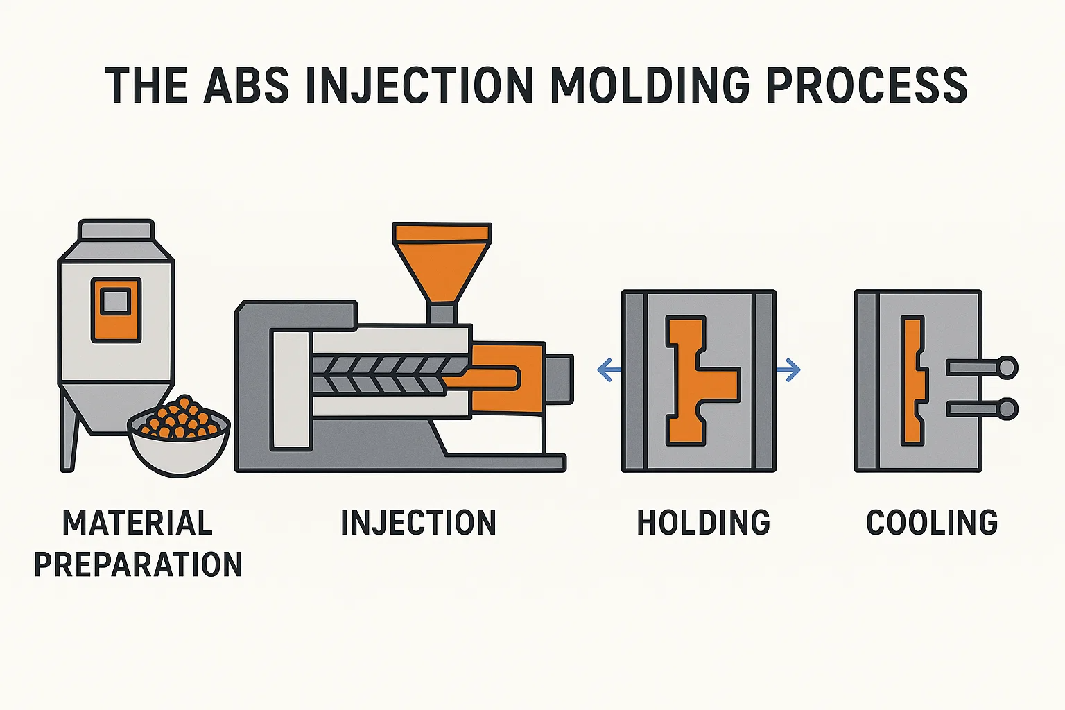 ABS: n injektiomuovausprosessi, vaikka se on pohjimmiltaan samanlainen kuin muilla kestomuoveilla, vaatii huolellista huomiota tiettyihin parametreihin ABS: n ainutlaatuisten ominaisuuksien hyödyntämiseksi ja korkealaatuisten osien varmistamiseksi. Prosessi on syklinen, ja se tuottaa uuden osan jokaisesta täydellisestä syklistä.