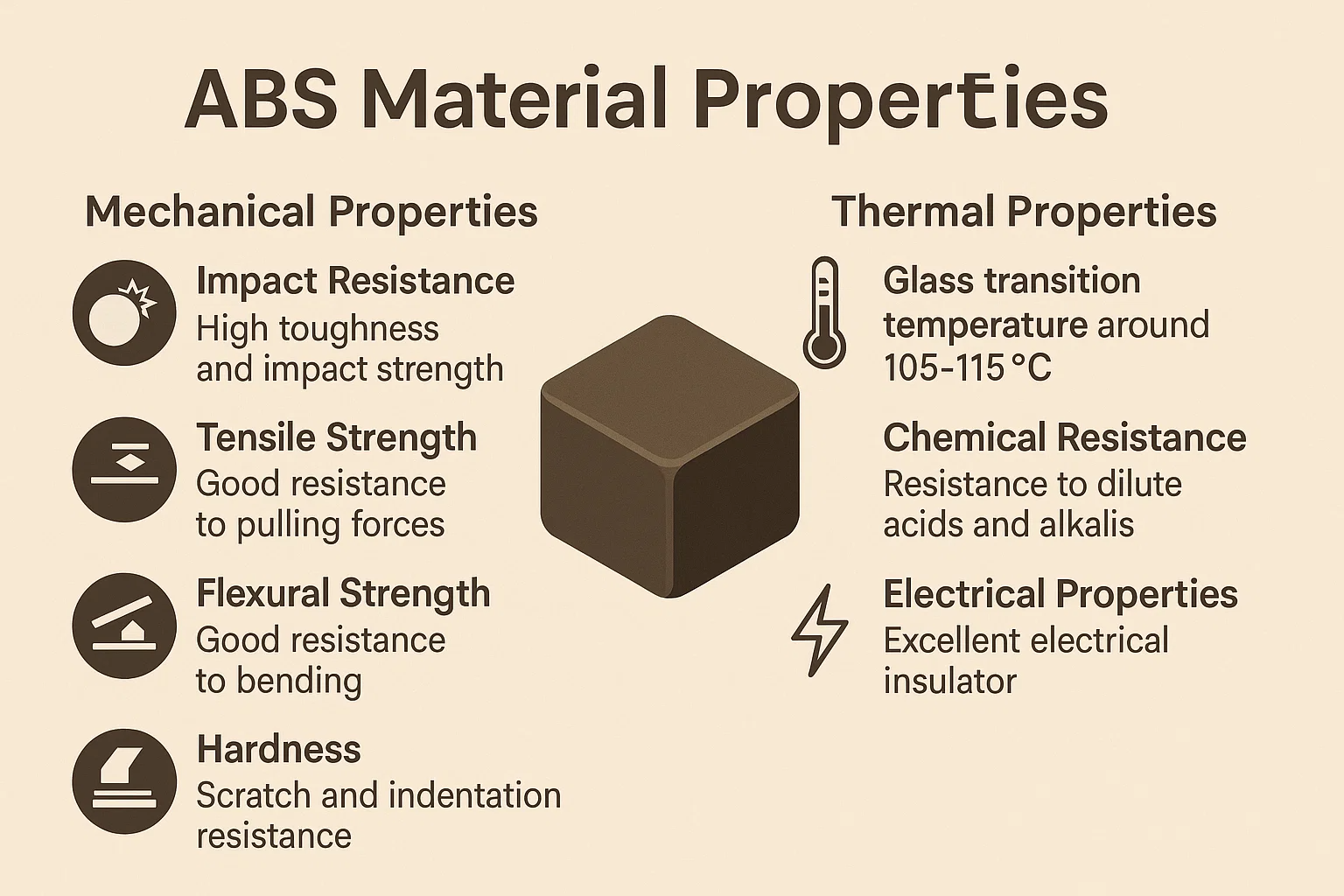 Lasinsiirtymän lämpötila (TG): ABS: n TG laskee tyypillisesti välillä 105 ° C - 115 ° C (suunnilleen 221 ° F - 239 ° F). Tämän lämpötilan alapuolella materiaali on jäykkä ja lasinen; Sen yläpuolella siitä tulee kumisempi ja taipuisempi, mikä mahdollistaa käsittelyn.