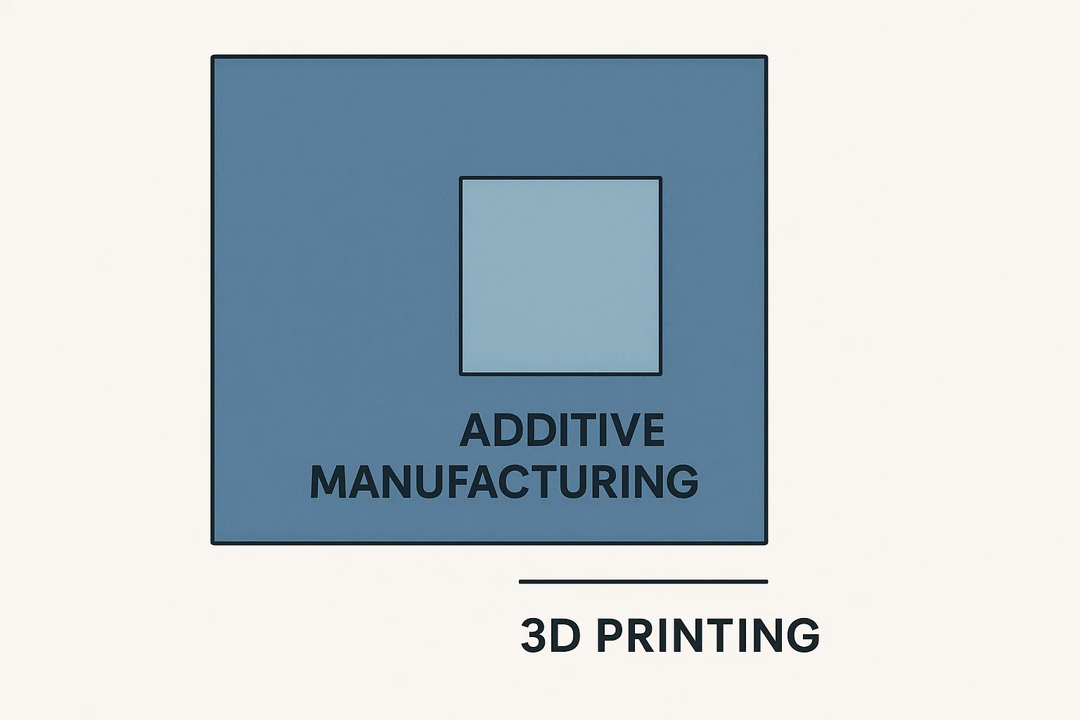 Vaikka 3D -tulostus ja lisäaineiden valmistus käytetään usein keskenään, eivät ole synonyymejä; Pikemminkin 3D -tulostus on erityinen muoto laajemmasta teollisuusprosessista, jota kutsutaan lisäaineen valmistukseksi.