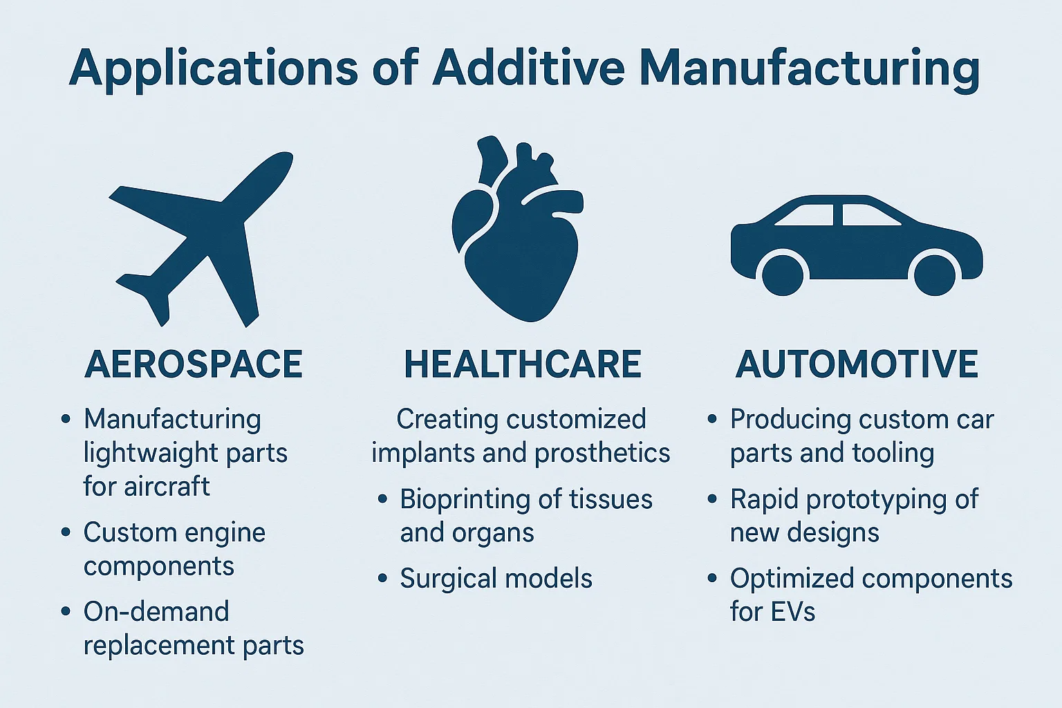 Ilmailu- ja avaruusteollisuus on merkittävä varhainen käyttöönottaja ja lisäaineiden valmistuksen saaja, mikä johtuu kevyiden, korkean suorituskyvyn osien kriittisestä tarveesta, joka kestää äärimmäisiä olosuhteita.