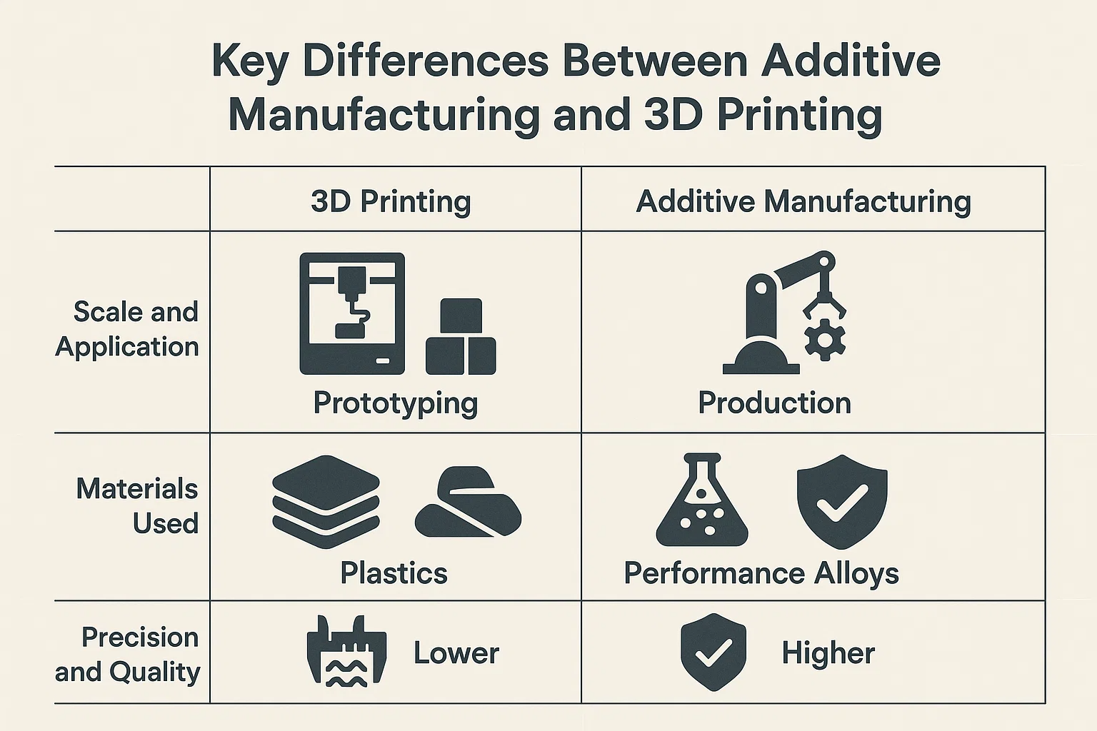 Vaikka 3D -tulostus on eräänlainen lisäaineiden valmistus, niiden erottelun ymmärtäminen on elintärkeää näiden tekniikoiden koko laajuuden ja ominaisuuksien arvostamiseksi. Erot ovat pääasiassa niiden mittakaavassa, tyypillisissä sovelluksissa, käytetyissä materiaaleissa sekä niiden tuotoksista odotettavissa oleva tarkkuus ja laatu.