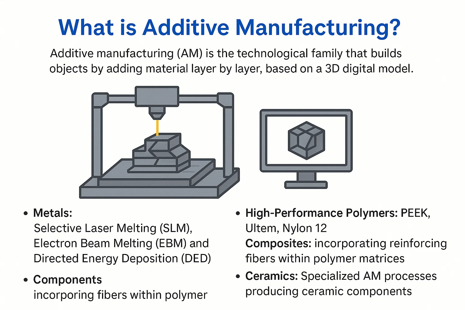 Vaikka 3D -tulostus tuo usein mielenpöytäkoneita, jotka valmistavat muovisia prototyyppejä, Lisäainevalmistus (AM) määrittelee paljon laajemman ja hienostuneemman teollisuusprosessin. Se on muodollinen, teollisuudessa tunnustettu termi teknologiselle perheelle, joka rakentaa esineitä lisäämällä materiaalikerroksen kerroksen mukaan 3D-digitaalisen mallin perusteella. Jos 3D-tulostusta voidaan pitää jäävuoren saatavana olevana kärjenä, lisäaineiden valmistus edustaa laajaa, monimutkaista ja voimakasta massaa pinnan alla, keskittyen korkean suorituskyvyn, toiminnallisten loppukäyttöosien tuottamiseen.