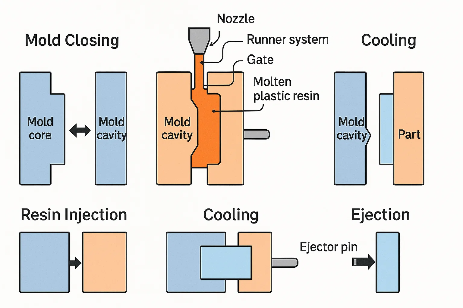 Muotin sulkeminen: Prosessi alkaa muottiydin ja muotin ontelo, joka liikkuu toisiaan kohti, kunnes ne puristuvat yhteen. Tämä toiminta luo suljetun sisäisen tyhjiön - viimeisen osan muodon. Tämän suuntauksen tarkkuus on kriittinen, koska mikä tahansa väärinkäyttö voi aiheuttaa a "Flash" (Ylimääräinen materiaali, joka valuu jakoviivaa pitkin).