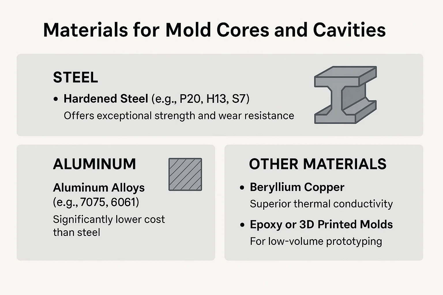 Alumiiniseoksia (esim. 7075, 6061) käytetään usein prototyyppimuotteihin tai pienillä volyymituotanto-ajoissa (tyypillisesti alle 100 000 osaa).
