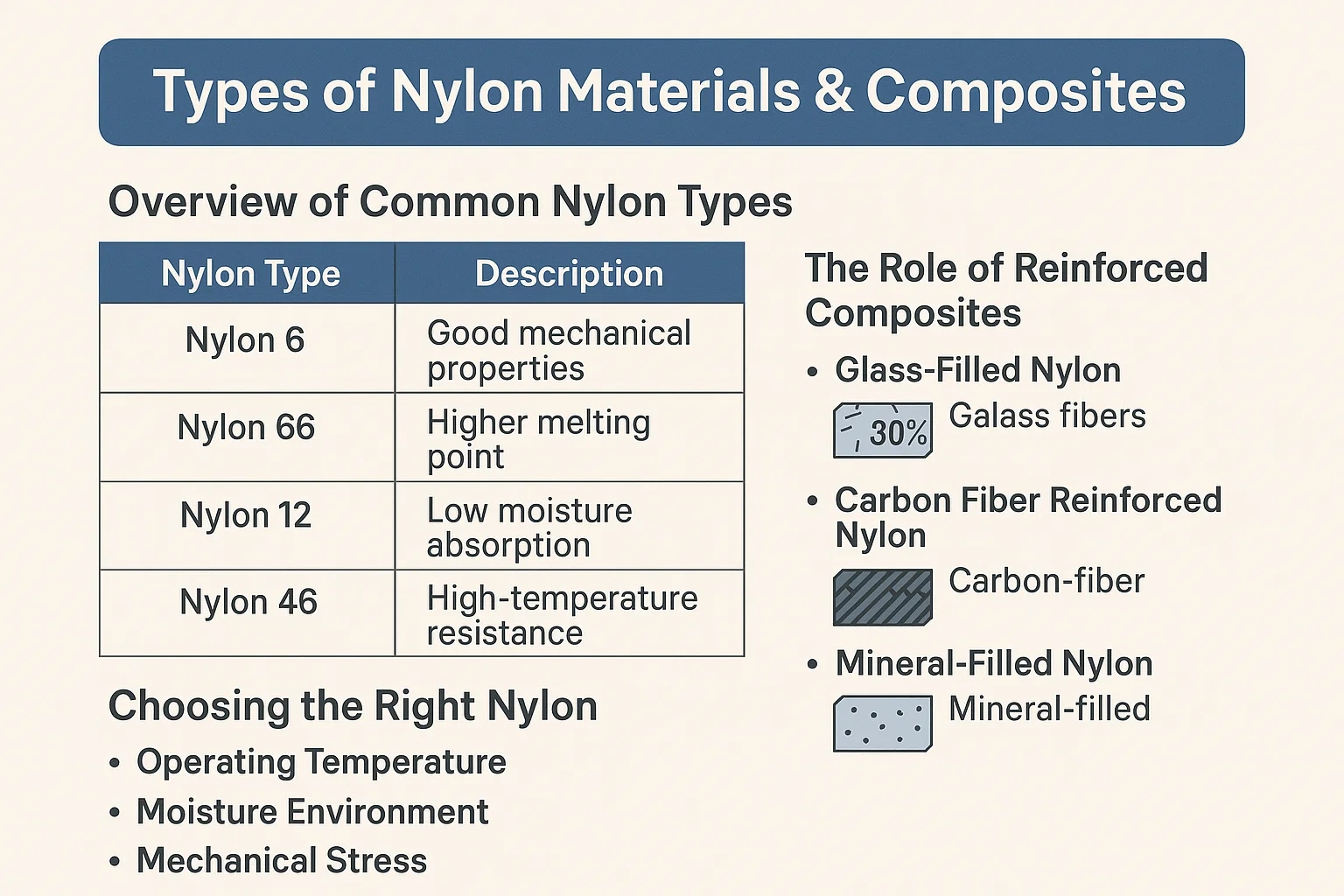 Mineraalitäytteinen nylon: Käytetään parantamaan mittojen vakautta, vähentämään kutistumista ja saavuttamaan tasaisempi pintakäsittely, vaikka yleensä kompromissilla on iskulujuus.