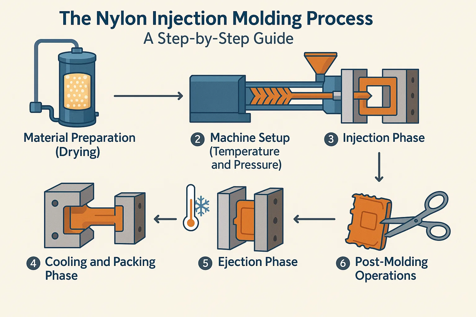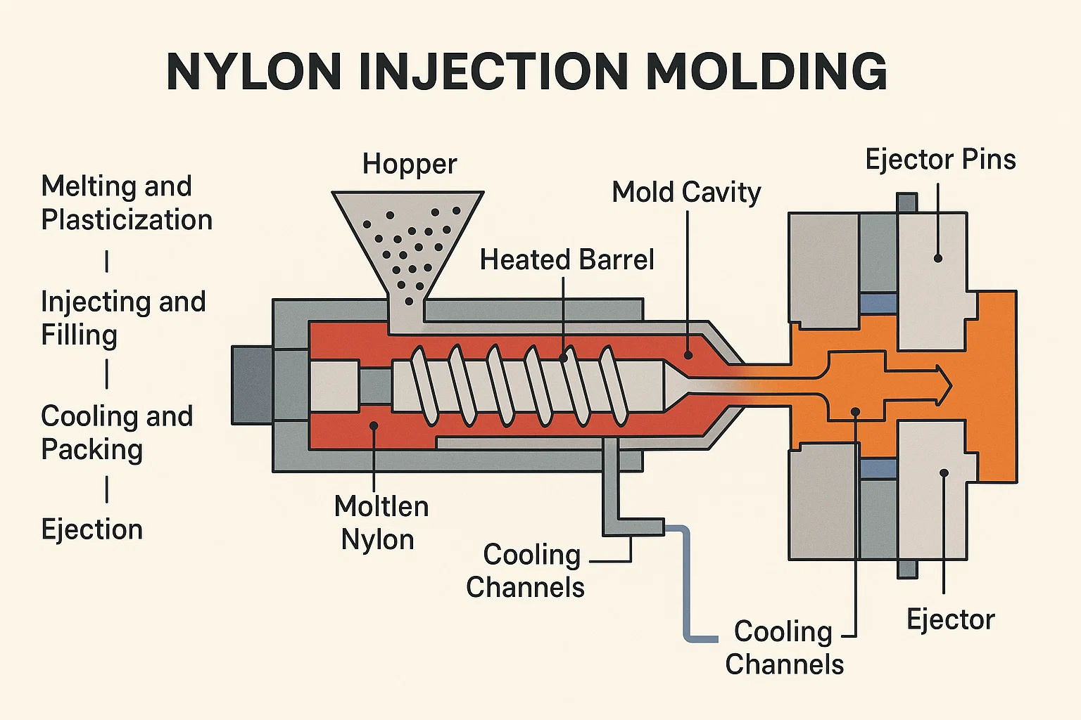 Prosessi on pohjimmiltaan samanlainen kuin muiden muovien ruiskuvalu, mutta se vaatii erityistä huomiota lämpötilaan, kosteuden hallintaan ja ruiskutuspaineeseen nailonin ainutlaatuisten materiaaliominaisuuksien (erityisesti sen korkean sulamispisteen ja hygroskooppisuuden) vuoksi.