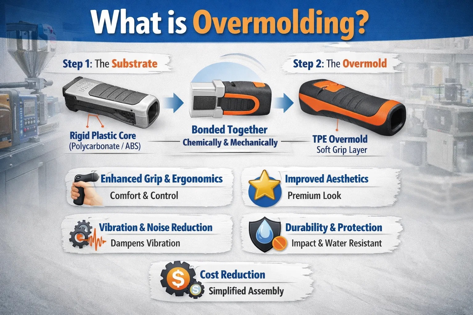 - Overmold: Tämä on valettu materiaali ohi substraatti. It acts as the “skin,” providing grip, color, or protection.