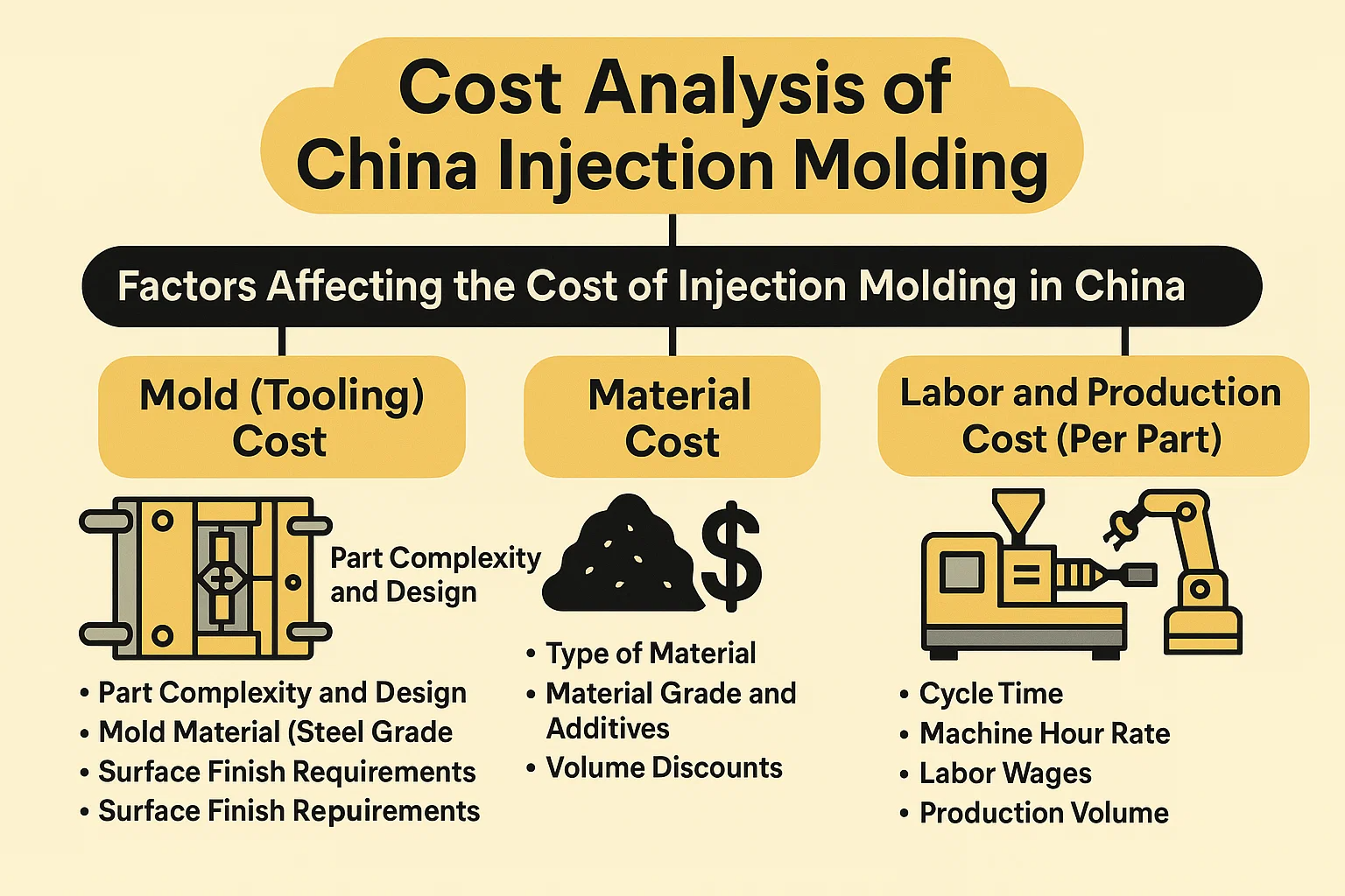 Yksi yritysten ensisijaisista motivaatioista valita Kiina injektiomuovaukseen on havaittu kustannusetu. Vaikka Kiina tarjoaa yleensä kilpailukykyisempiä hinnoitteluja kuin monet länsimaat, ymmärtäminen eri kustannuksiin vaikuttavien tekijöiden ymmärtäminen on ratkaisevan tärkeää tarkan budjetoinnin suhteen ja odottamattomien kulujen välttämiseksi. Injektiomuovausprojektin kokonaiskustannukset voidaan luokitella laajasti homeen (työkalujen) kustannuksiin, materiaalikustannuksiin ja tuotanto-/työ-/koneisiin.